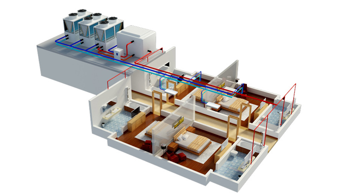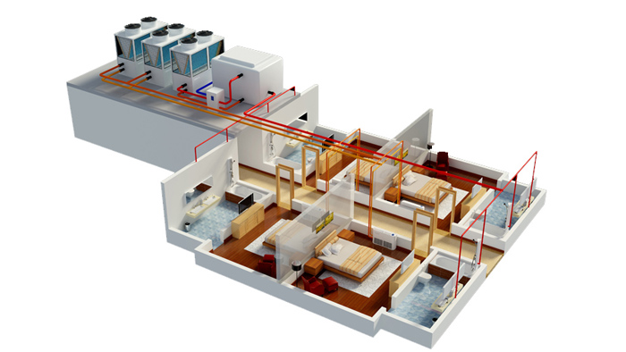 冬季:采暖和热水符合都比较大,模块机启动制热运行,提供房间供暖,三联供优先运行制热水,保证热水供应,当热水达到设定温度后,自动转换为制热运行,以充分满足供暖需求。