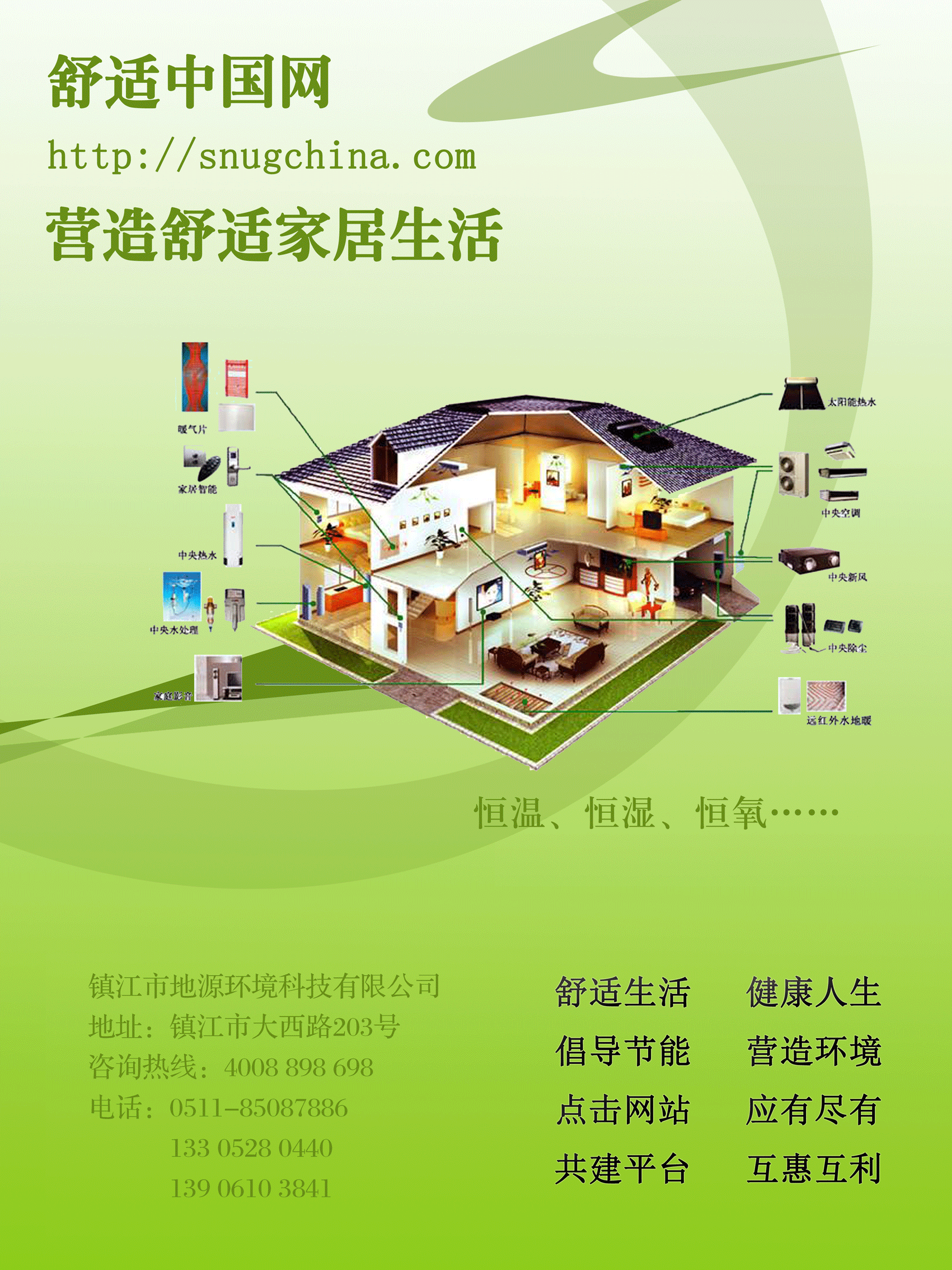 —舒适中国网是国内领先的室内舒适环境系统集成服务商,致力于为人类提供舒适、健康、现代的家居生活,以电子商务平台为用户提供中央空调、地源热泵、家庭采暖、新风系统、中央除尘、中央净水、中央热水、太阳能、智能家居等舒适家居系统集成解决方案;同时在能源领域进行技术研发、应用、数据处理、系统集成和安装施工,提供绿色建筑节 能系统配套服务和节能服务。